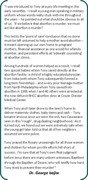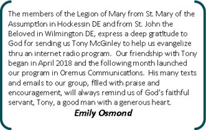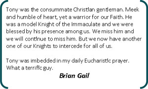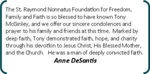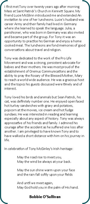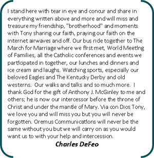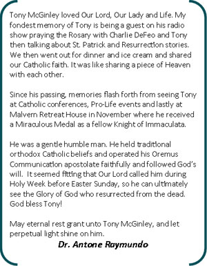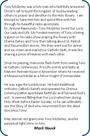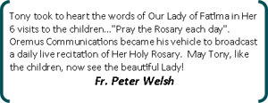 We here at Oremus Communications sadly announce the passing of our founder Anthony J. McGinley on Holy Thursday, April 9, 2020. Tony, as he was affectionately called was a loving son of the Blessed Mother. He was dedicated to promoting all messages of Fatima - the praying of the Holy Rosary and a staunch pro-life leader and warrior from the very beginning of the pro-life movement in 1973. Tony was a patriot and soldier in the USA army and loved God, country, family and friends. Mostly, he loved his Lord and Savior Jesus Christ and the Sacraments of The Catholic Church and The Blessed Mother. He will be greatly missed and irreplaceable! May the light of the Lord shine upon him and grant him peace and may he forever be our guardian intercessor in and for the mission he started.